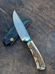 Klinge: Damaszenerstahl, "Rose" Hohe Schnitthaltig- und Verschleißfestigkeit, rostbeständig, ca. 60-61 HRC.